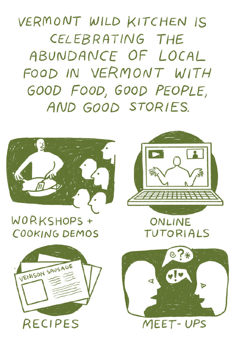 Vermont Wild Kitchen was born in 2020 during the early days of the pandemic, when we streamed cooking shows from kitchens across the state. Now, we bring those same local, wild, and farmed ingredients to in-person events that strengthen connections and celebrate the food and people of Vermont.